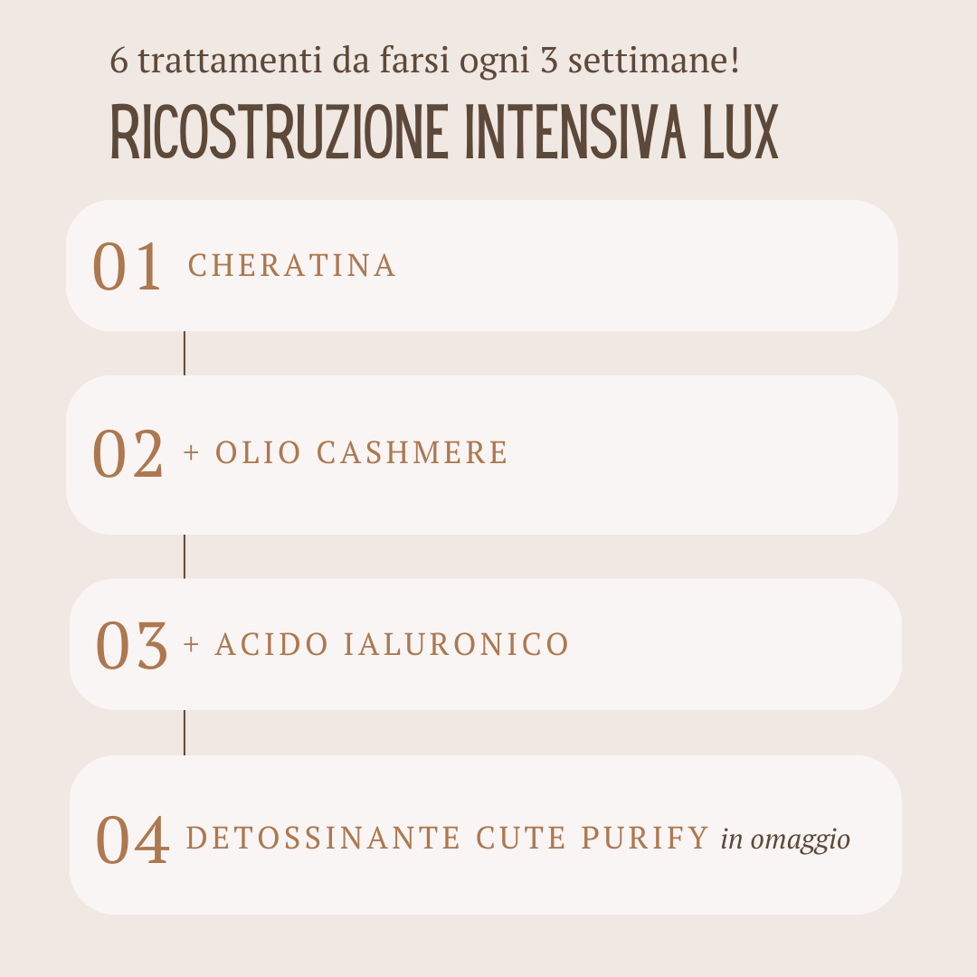 6 trattamenti, 1 ogni 3 settimane con la nostra Ricostruzione Intensiva Lux, arricchita con cheratina, olio di Cashmir e acido ialuronico.